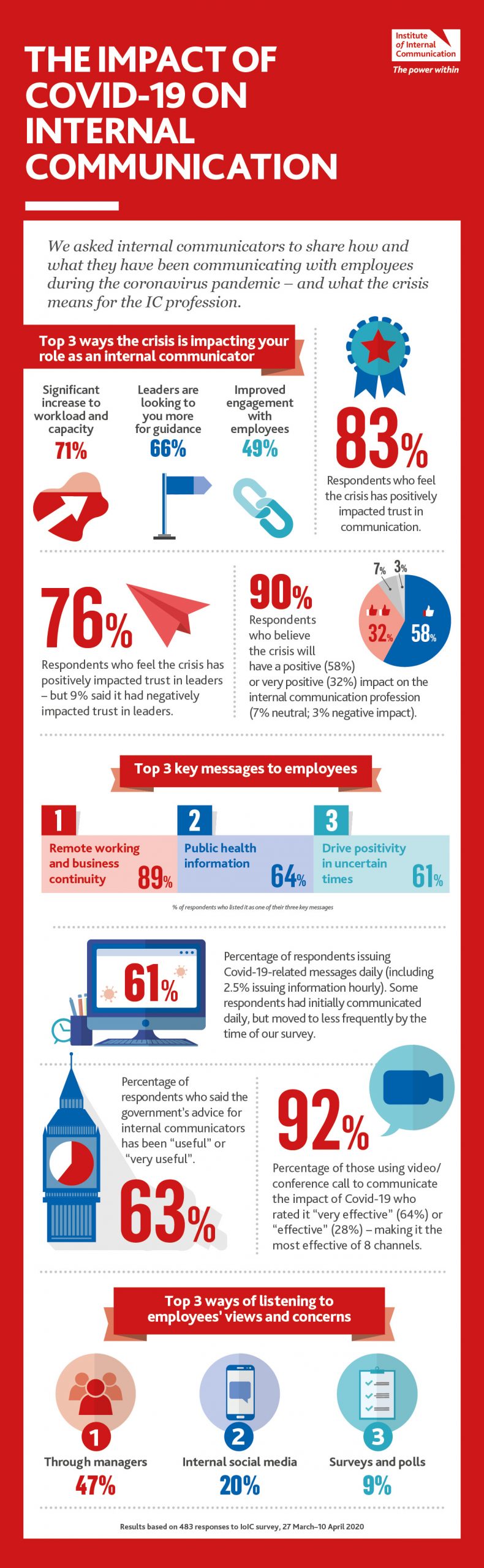 Between March and April, nearly 500 internal communications professionals completed IoIC’s (Institute of Internal Communication) Covid-19 survey. The survey was created to determine how the pandemic has positively impacted brand presence and reputation.